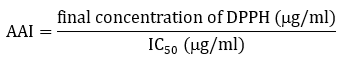 The IC50 (concentration providing 50% inhibition) was calculated graphically using a calibration curve in the linear range by plotting the extract concentration vs the corresponding scavenging effect. The antioxidant activity was expressed as the antioxidant activity index (AAI), calculated as follows as [11]:
