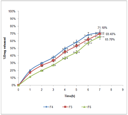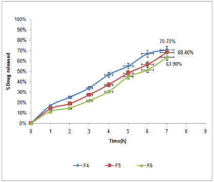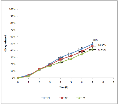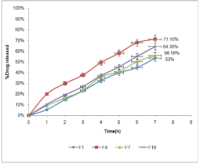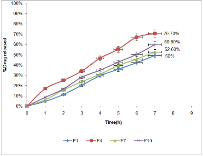 F7 which contain HPMC K4M was 52.6% and F10 was 59.8% which contain chitosan after 7 h dissolution respectively.