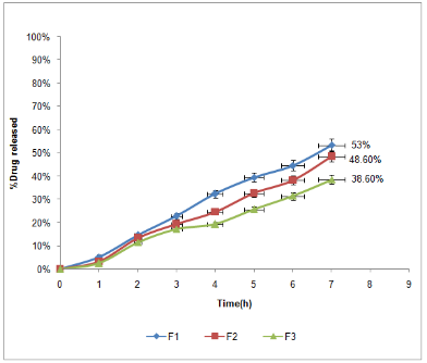 For rosuvastatin calcium, fig. 2 demonstrates the effect of type of polymer on the release profile. F4 had the higher release (70.7% after 7 h) (*P<0.05) which contained MCC and the lower sustain release was recorded for F1 (50% after 7 h) (*P<0.05) which contained xanthan gum.