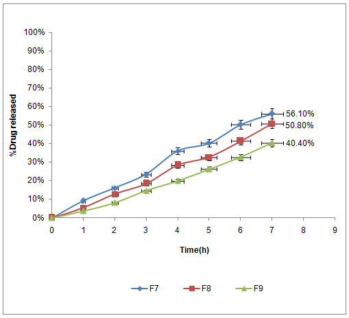 Fig. 8: In vitro dissolution for studying the effect of amount of polymer on the In-vitro release profile of rosuvastatin calcium from tablets contain HPMC K4M polymer in 6.8 buffer (F7:10 mg HPMC K4M, F8:20 mg HPMC K4M and F9:30 mg HPMC K4M)