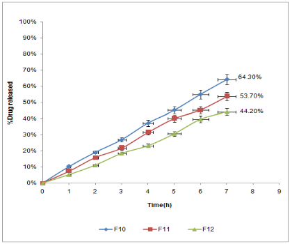 Fig. 9: In vitro dissolution for studying the effect of amount of polymer on the In-vitro release profile of aspirin from tablets contain chitosan polymer in 6.8 buffer (F10:10 mg chitosan, F11:20 mg chitosan and F12:30 mg chitosan)