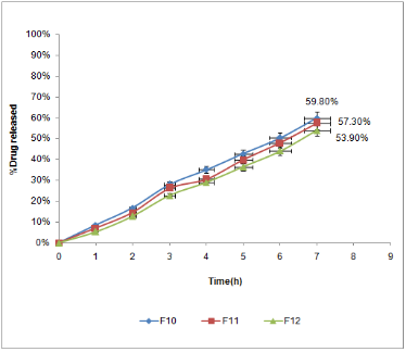 Fig. 10: In vitro dissolution for studying the effect of amount of polymer on the In-vitro release profile of rosuvastatin calcium from tablets contain chitosan polymer in 6.8 buffer (F10:10 mg chitosan, F11:20 mg chitosan and F12:30 mg chitosan)