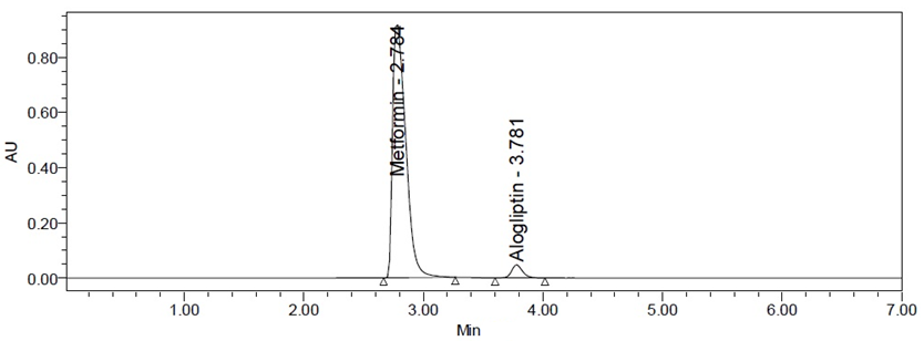 20 tablets each containing alogliptin 12.5 mg and metformin 500 mg were powdered and calculated the average weight of each tablet. The tablet powder equivalent to 20 tablets was weighed and transferred into 50 ml volumetric flask. Add 30 ml of the diluent to dissolve the powder and sonicate it for about 25 min and further the volume was made up with diluent. From the prepared solution, 1 ml was pipetted out and transferred into 10 ml of volumetric flask and make up the volume with diluent. From the prepared solutions, 10 µl of the sample solution was injected into HPLC system and peak area response was compared with standard values and the % assay was calculated. The % assay was found to be 99.88%for alogliptin and 99.64% for metformin.