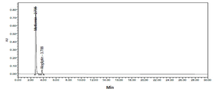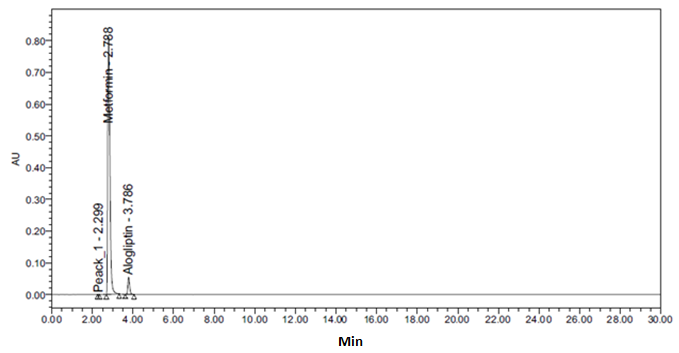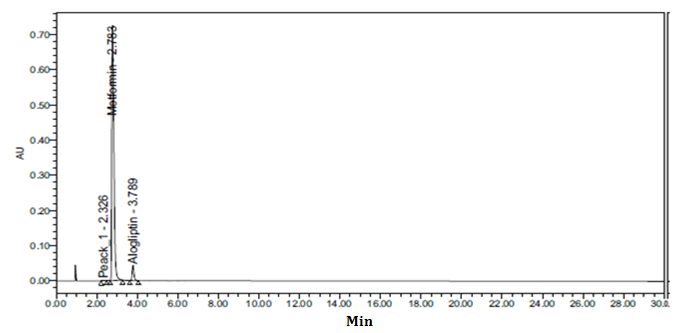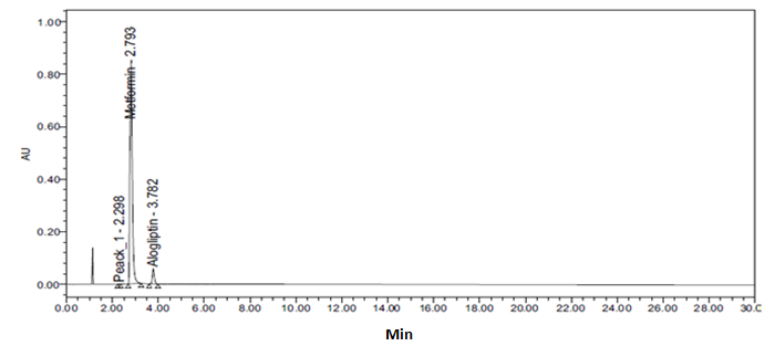 The main objective of the present work is to develop and validate a stability indicating assay method for simultaneous estimation of alogliptin benzoate and metformin hydrochloride by reverse phase high-performance liquid chromatography. During the mobile phase selection, it was found that the acidic nature of the buffer could help in separating four drugs with good resolution. Then it was thought of changing pH of the buffer at different ranges like 2.5, 3.5, 4.5 & 6 to separate the samples. The best results were achieved with Hypersil BDS C18, (250 x 4.6 mm, 5m). C18 asymmetry column witha mobile phase consisting of Phosphate Buffer: Acetonitrile in the ration of 48:52 %v/v at a flow rate of 1 ml/min. Samples were analyzed at 210 nm at an injection volume of 10 μL. The proposed method was optimized to give a sharp peak with minimum tailing (fig: 2).