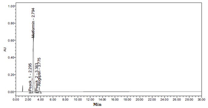 Forced degradation studies were performed to demonstrate the stability of the sample. Degradation studies were carried out under conditions of hydrolysis, dry heat, oxidation, UV light, and photolysis. Acid hydrolysis was performed by treating the drug with 2N HCl at room temperature for 24 h and it was showed little degradation of alogliptin and metformin with degraded products peak at retention time 2.362. For alkali degradation, the drug was treated with 2N NaOH. A chromatogram of base hydrolysis showed degradation of the sample with degraded product peak at retention time 2.295 and 3.383. Degradation studies under oxidative conditions were performed by heating the drug sample with 30% H2O2at 60 oC and degraded product peaks were observed.