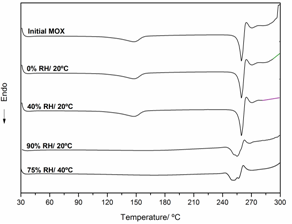 Table 1: Initial thermal parameters and HPLC results as well as after 1 mo of storage at 20 °C in 90 % RH and 40 °C at 75 % RH for MOX