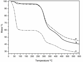 A TG curve was obtained employing a SII Nanotechnology IncTM. (Tokyo, Japan) model EXSTAR TG/DTA7300TM thermo-balance in the temperature range of 30 to 600 °C, using opened aluminum crucibles and weighing approximately 4 mg of sample, under a dynamic dry N2 atmosphere (50 ml/min) and at a heating rate of 10 °C/min. The TG instrument was first calibrated using indium (156.6±0.3 °C and heat of fusion of 28.58±0.3 J/g) and standard weights under the same conditions as the samples.