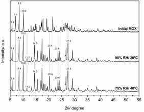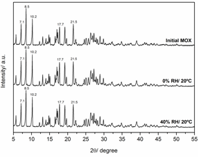 Fig.3: PXRD patterns of the initial MOX and samples stored for 1 mo at 20 °C in 0 % RH and 40 % RH