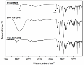The IR spectra corroborated with the results obtained by the other techniques. There were not any visible changes in IR spectra of the initial sample and the sample stored at the temperature 20 °C in 0 % RH and 40 % RH. The most important changes occurred for the samples stored at 90 % RH and 75 % RH, as illustrated in fig. 5. One of the detected changes occurred in the region of O–H stretching vibrations involved in the hydrogen bonds region from approximately 3600-3150 cm-1. The other alteration occurred in the 1705 cm-1, region of C=O stretching vibrations. These spectral variations can be attributed to the hydration of MOX due to its exposure at high humidity, as observed in the previously demonstrated results.