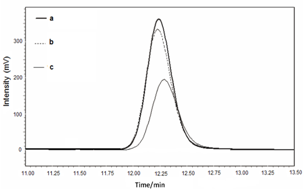 As a final evaluation of this stability study, the samples that have displayed differences in its crystal lattice (exposed for one month at 20 °C in 90 % RH and at 40 °C in 75 % RH) were analyzed (triplicate samples) by the HPLC method for MOX assay [28]. This HPLC method for the quantification of MOX is important because it is possible to conclude if occurred the drug degradation, or if really happened the appearance of another crystalline form. The representative chromatograms obtained from the initial MOX and the samples stored under stress conditions are illustrated in fig. 6. The initial MOX showed retention time of 12.24 min approximately, and the area obtained from this analysis was considered as 100 % in order to compare the content with the stored samples. In this analysis, no alteration in the chromatographic profile and in the time retention of both samples were observed and there were no peaks from degradation products, evidencing that is the same substance, but in another crystalline form. As can be seen in table 1 the API´s storage under the stress conditions showed a reduction in its concentration, which is justified by the presence of water in the structure of the hydrates as observed in thermogravimetric analysis.