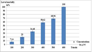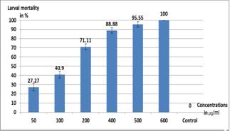 After exposing the larvae of stages 3 and 4 of the species An. labranchiae to the various concentrations of essential oils for 24 h, the mortality rate ranged from 7.14 to 100% for T. vulgaris (fig. 1), and from 27.27 to 100% for O. majorana (fig. 2). Fig. 1 below shows the larvicidal effect of the essential oil of T. vulgaris on An. Labranchiae. We found 100% mortality of larvae at 600 µg/ml concentration. With the same concentration for O. majorana, we found 100% mortality of larvae of An. labrancheae (fig. 2).