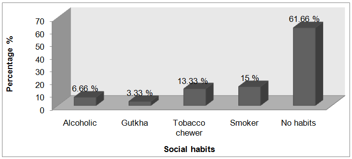 A total of 60 patients included in this study, 43 (71.7 %) were primary hypertensive patients and 17 (28.3 %) were hypertensive with diabetes mellitus patients. There were 29 (48.33%) males and 31 (51.66%) female patients were involved. (table 1), Maximum patients were within the age interval of 40-50 y (26.67%) and minimum were 30-40 y (11.66 %). (table 2). The family history of the patients revealed that majority of the patients (78.33%) does not have any family history of hypertension, followed by (21.66%) in whom there was underlying family history of Hypertension (table 3). The social habits of the study population were observed and found to be that, most of the patients were having the habit of cigarette smoking 9 (15 %) followed by 8 (13.33 %) were having chewing tobacco (fig. 1).