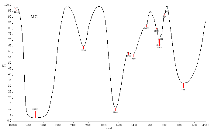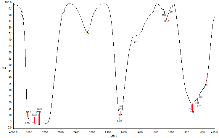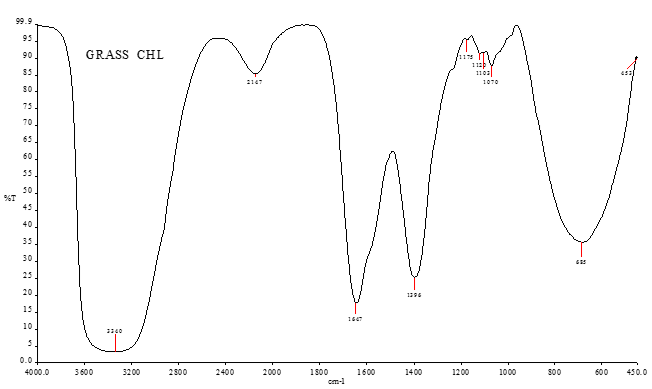 The partially purified CHL was ground with IR grade potassium bromide (KBr) (1:10) pressed into discs under vacuum using spectra lab Pelletier. The IR spectrum was recorded in the region 450-4000 cm-1 using Shimadzu FT-IR 8000 series instrument.