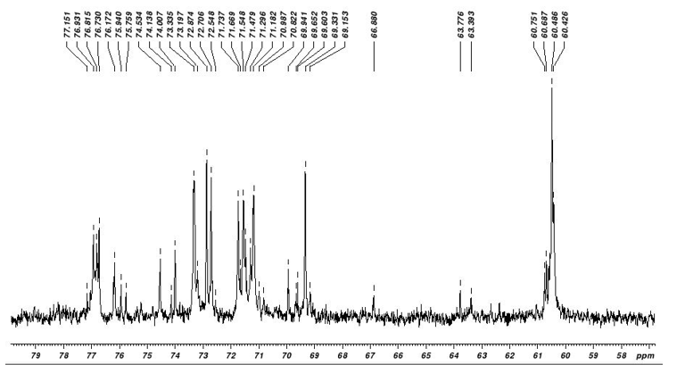 The peak at 77.151 Δ represents C=O. The peaks from 74.138-70.822 Δ corresponds aromatic structure. The peaks near 69.153-69.652 Δ represent C=N group and the peaks from 63.010–63.776 Δ represents aromatic CH3 group. The peak at 60.486 Δ corresponds CH3COONaand the peak at 77.151 Δ represent C=O. The peaks from 74.007–70.182 Δ corresponds aromatic structure. The peaks near 69.603-61.331 Δ represents C=N group and the peaks from 63.010–63.776 Δ represents the aromatic CH3 group. The peak at 60.486 D Δ represents aromatic CH3COONa group (table 3; fig. 11).