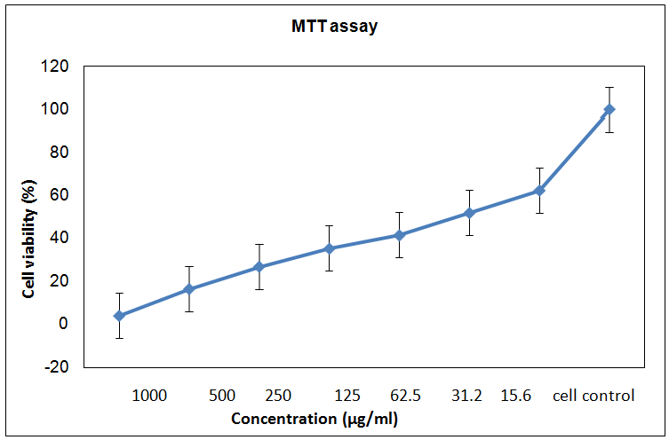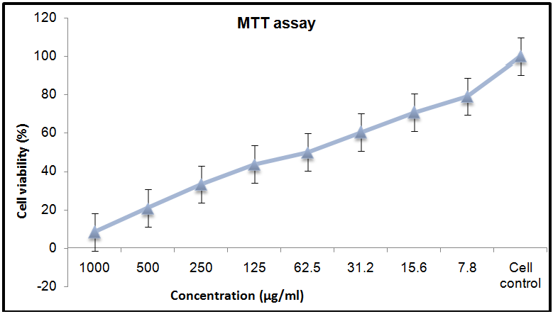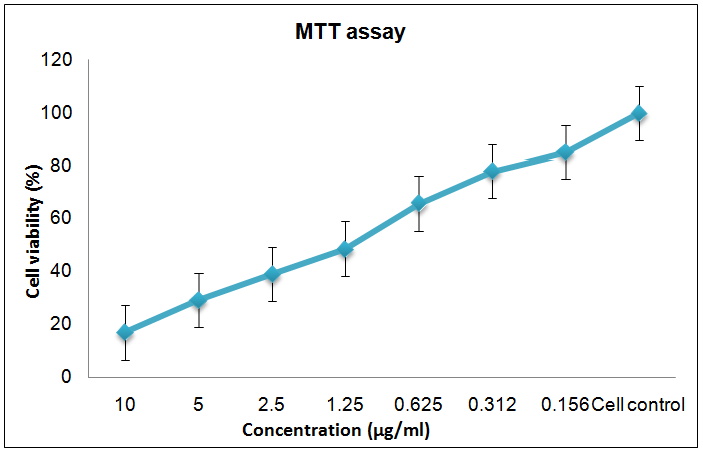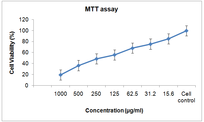 In order to study the antitumor activity of a new drug, it is important to determine the cytotoxicity concentration of the drug. Cytotoxicity tests define the upper limit of the extract concentration, which is non-toxic to the cell line. The concentration at which the drug is nontoxic to the cells is chosen for antiviral assay.After the addition of the drug, cell death and cell viability was estimated. The result is confirmed by additional metabolic intervention experiment such as MTT assay [7].