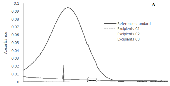 Fig. 2: Absorption spectra of nimesulide standard and excipients, in 0.01 M NaOH (A) and excipient plus capsules from compounding formulations solutions in potassium phosphate buffer (B)