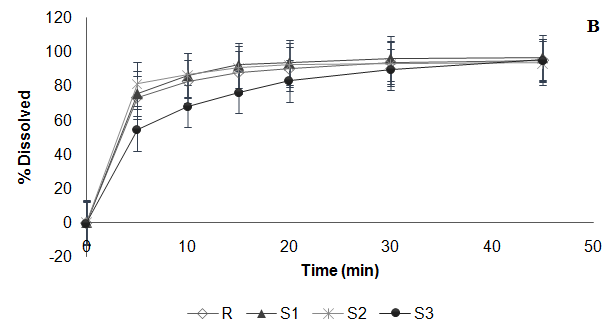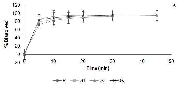 Dissolution profiles of the tablet formulations are shown in fig. 3 (A and B). According to the Brazilian Pharmacopeia, at least 75% of the drug should be released from the tablet during the 45 min of the test [15]. In this study, all tested tablet formulations reached 75% release after 5 min of the assay.