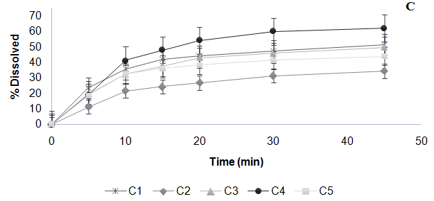 The formulation that showed the most unsatisfactory performance was C2, for which only 30% of the drug was released after 45 min. C2 contains sodium lauryl sulfate, microcrystalline cellulose, and starch (table 1), but lacks a water-soluble substance to act as the wetting agent (sodium lauryl sulfate) in order to promote dissolution.