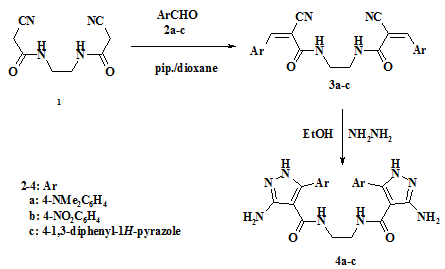 Scheme 1: Synthesis of N, N'-Ethane-1,2-diylbis[3-aryl-2-cyanoacrylamide] (3a-c) and bis-pyrazole derivatives 4a-c