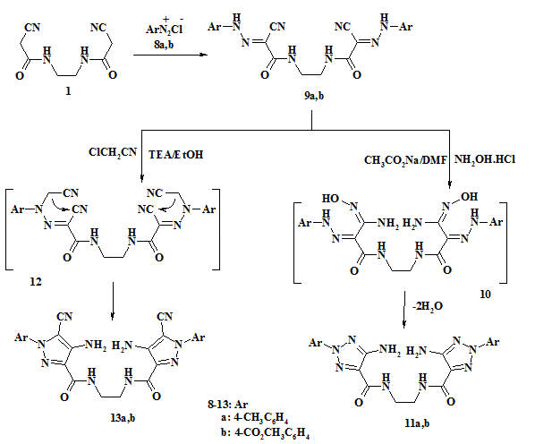 Next, coupling products derived from reactions of diazonium salts with active methylene compounds are widely used as intermediates for the synthesis of a large number of heterocyclic compounds [36-38]. Also, heterocyclic azo compounds are well known for their use as antineoplastics, [39] antidiabetics, [40] antiseptics, [41] antibacterial, [42] and are known to be involved in a number of biological reactions such as inhibition of DNA, RNA and protein synthesis, carcinogenesis and nitrogen fixation [41,43]. Thus, bis-cyanoacetamide 1 coupled with diazonium salts 8a,b derived from the appropriate aromatic amines (4-methylaniline and 4-methoxycarbonylaniline) in EtOH buffered with sodium acetate, to afford the respective hydrazones 9a,b (scheme 3). The structure of the reaction products 9a, b was confirmed by their elemental analysis and spectral data (MS, IR, 1H NMR, [13]C NMR). Thus, the structure of 9a is supported by its mass spectrum, which showed a molecular ion peak corresponding to the formula C22H22N8O2 (M+, 430). The 1H NMR spectrum showed signals at δ = 2.26 ppm (s, 6H, 2 CH3), δ = 3.37 ppm (s, 4H, 2NCH2), δ = 7.16 ppm (d, 4H, J = 7.8 Hz), δ = 7.53 ppm (d, 4H, J = 7.8 Hz), δ = 8.34 ppm (s, 2H, D2O-exchangeable, 2NH), δ = 11.66 ppm (s, 2H, D2O-exchangeable, 2NH). Moreover, [13]C NMR spectrum showed the presence of peaks at δ = 20.38, 38.41, 106.74, 111.44, 115.79, 129.49, 133.02, 139.83, 161.29 and The IR spectrum revealed absorption bands at 3315, 3235 (2NH), 2925 (aliphatic CH), 2212 (C≡N), 1645 (C=O). In the 1H NMR spectra of compounds 9a, b indicated that the absence of signal assignable to azomethine group (CH-N=N-) [44] at δ = 3.00-4.00 ppm ruled out azo form and support the hydrazone structure of the reaction products.
