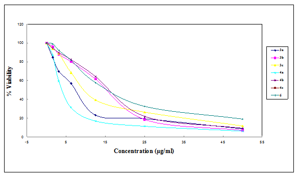 Fig. 1: Effect of the compounds 3a-c, 4a-c and 6 on cellular viability (HEPG-2 cells); Values are the mean of three independent experiments; a standard deviation of twofold was judged acceptable