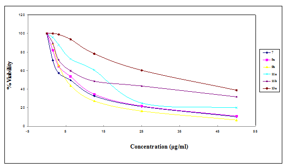 Fig. 2: Effect of the compounds 7, 9a,b, 11a,b and 13a on cellular viability (HEPG-2 cells), Values are the mean of three independent experiments; a standard deviation of twofold was judged acceptable