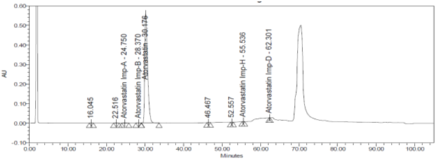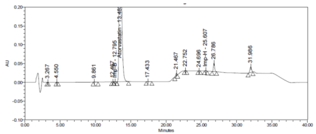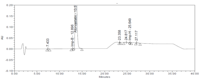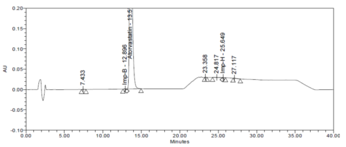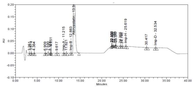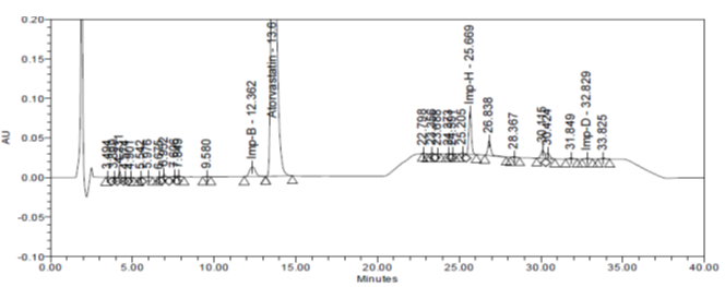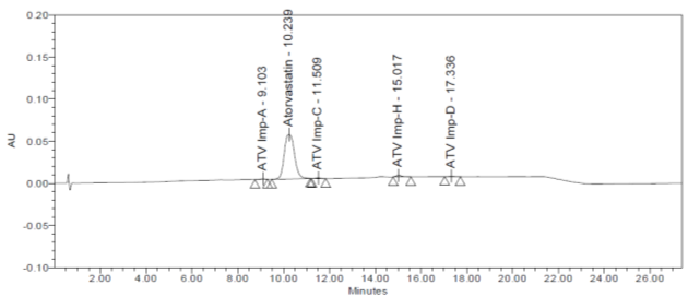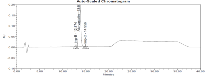 Here, one of the impurity named as Imp B was not seen, as it probably merged with the main peak, since peak purity was out of the range for ATV peak and resolution between ATV and Imp C was found to be lesser than 1.5, this experiment did not work, since it was not meeting the system suitability criteria. Representative chromatogram is shown in fig. 3.