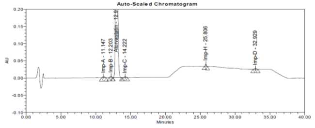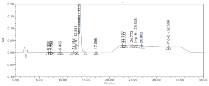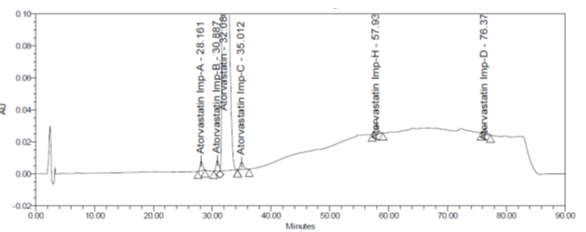 ATV is a synthetic hydroxymethyl glutaryl coenzyme A (HMG-CoA) reductase inhibitor that has been demonstrated to be efficacious in reducing both cholesterol and triglycerides. It is administered as the calcium salt of the active hydroxy acid and is used between 10 and 80 mg per day to reduce the raised lipid levels in patients with primary hyperlipidemia (familial and non-familial) or combine hyperlipidemia [1]. As per the literature available, five impurities reported in drug substance (refer table 1) named as Imp A, B, C, D, and H [2] and for pharmaceuticals, there is no compendia method available either in the United States Pharmacopoeia (USP) and European Pharmacopoeia (EP). So far many methods are available for quantification of impurities, but the current developed method has a shorter runtime, which was obtained by using a gradient program ensuring that all the impurities elute out efficiently. The aim of the study is to develop a simple, reliable and accurate stability indicating a method for the determination of ATV and its process and also storage related impurities. This manuscript provides a detailed procedure for the determination of relative response factors (RRF) for the quantitative determination of impurities.