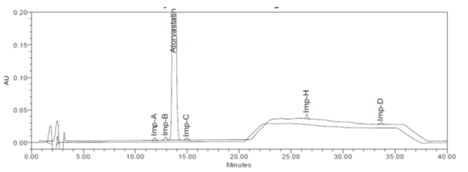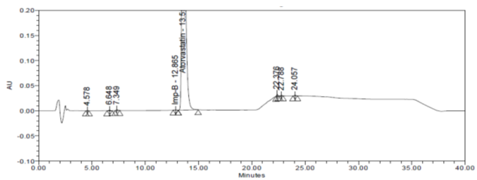 Imp-B is one of the isomers of ATV, and its peak separation was not seen even on a shorter column used in RP-HPLC.
