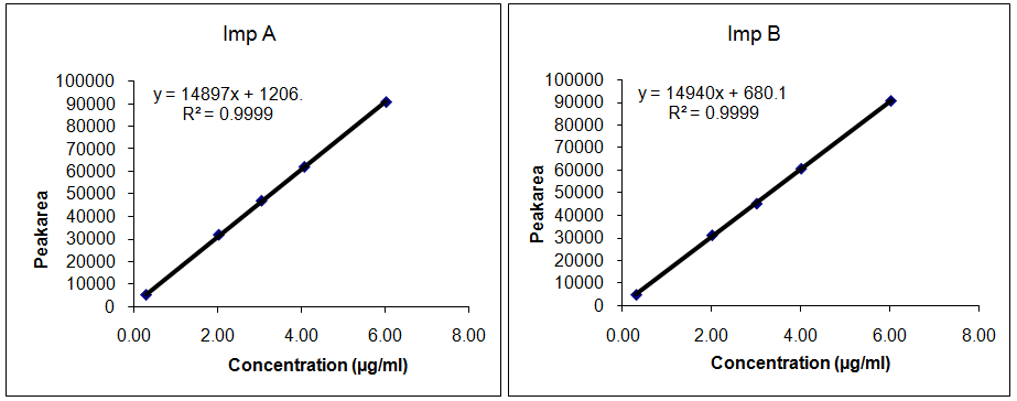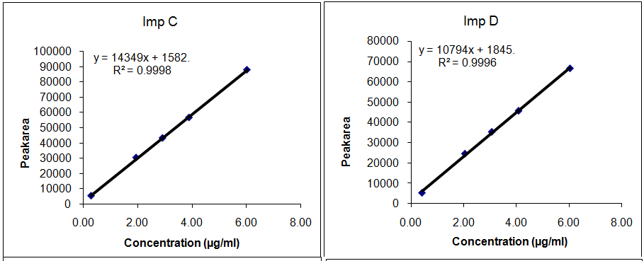The linearity of impurities was obtained and the correlation coefficient was found to be more than 0.999 for all impurities (refer table 13).