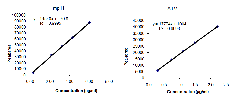 The Linearity was established by plotting a graph of concentration versus area response of ATV, impurities and the correlation coefficient was determined.