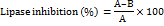 Lipase inhibitory activity of crude extracts were tested by mixing 1000 µl of each extract, 3 ml of olive oil emulsion (5% olive oil emulsified with 10% gum arabic) and 1 ml lipase (from A. niger, Hi Media) solution (1.56 mg/ml) followed by 30 min incubation at 37 oC. The control was prepared by replacing crude extract with phosphate buffer from the reaction mixture. The fatty acids liberated were estimated by titrating contents of reaction mixture against 0.05 M NaOH and using phenolphthalein (0.1% ethanolic) as pH indicator [18]. Lipase inhibition activity (%) of extracts was calculated as follows:
