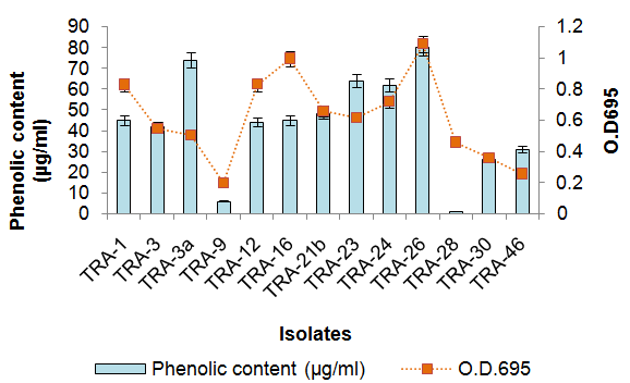 The results on detected phenol content and total antioxidant activities in crude extracts of selected actinomycetes are shown in fig.2. The antioxidant properties of bioactive compounds are mainly due to their redox properties that play an important role in absorbing and neutralizing free radicals [25]. The phenolic content found in crude extracts of selected actinomycetes was in the range of 1µg/ml to 80 µg/ml. The higher phenol content and antioxidant activity were observed in TRA-26 extract. Phenol content in antioxidant compounds is positively correlated with their antioxidant activities [26] and also acts as a key element for deciding the antioxidant efficacy of secondary metabolites [27]. The higher total antioxidant activity found in strain TRA-26 also confirmed the interdependence of phenolic content and antioxidant capacity of a secondary metabolite.