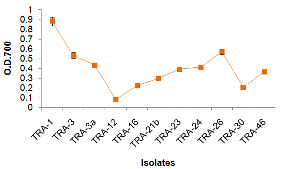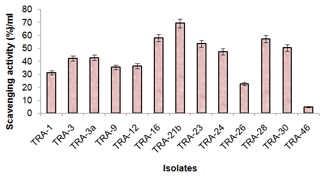 Radical scavenging ability of antioxidant compounds was evaluated extensively by using stable free radicals containing DPPH molecule. Of the total isolates selected for study, ten showed DPPH scavenging activity and was found in a range of 12.15% to 69.88 %. The strain TRA-3a showed the highest scavenging activity whereas it was least found in strain TRA-30. However, the recorded activities of all strains were lower than the ascorbic acid (100 µg/ml, 87.83%) which was used as a standard antioxidant compound. (fig. 1)