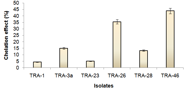 The reports on metal chelation capacity of actino bacterial secondary metabolites were least found in published literature. In the present study, activity was studied in terms of chelation of iron and was found only in six extracts (fig.5). The chelation capacity was more in TRA-46 which was comparable to standard chelating agent EDTA (60%, 100 µg/ml). Iron chelators play an important role to relieve the oxidative stress generated due to iron overload. The accumulation of toxic iron concentration can cause tissue damage leading to heart failure, hyperthyroidism, liver failure and early death [28].