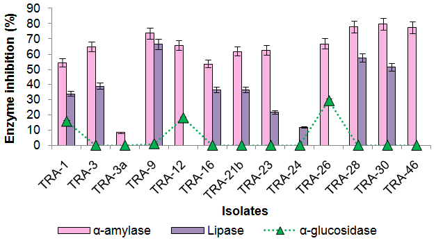 Lipases play a significant role in the development of obesity leading to type ІІ diabetes and cardiovascular diseases. Lipase inhibitors bind to intestinal lipases [30] preventing the hydrolysis of dilatory triglycerides to mono glycerides and fatty acids [31]. This reduces the absorption of fats resulting in lessened obesity. In the present study, extracts of nine isolates showed lipase inhibition activity with the highest inhibition found in the presence of TRA-9 extract (65%). Orlistat was used as a standard lipase inhibitor. Although lower than orlistat (100 µg/ml, 80.92%) and studied at primary level, the inhibition shown by TRA-9 crude extract was noticeable.
