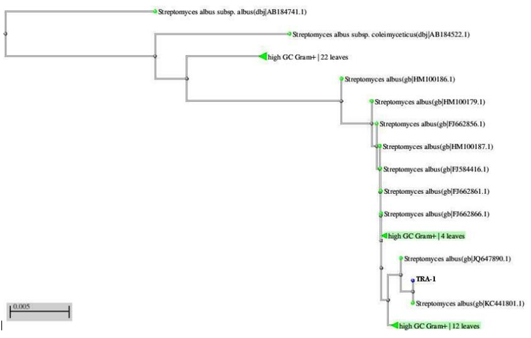 The actinomycetes strain TRA-1 isolated from the rhizosphere of C. longa was identified as Streptomyces genus according to its ability to form substrate and aerial mycelium and form spiral spore chains. The isolate produced colonies with light pink spore mass on SCA with pale yellow reverse. The cell wall chemo type І was designated by observing the presence of LL-Diaminopimelic acid and without any characteristic sugar pattern in cell wall hydrolysate. Further characterization of TRA-1 was done by 16S rRNA analyses. The isolate showed 99% homology with existing species of S. albus (KC441801.1). The taxonomic position of the isolate is shown in fig. 8.