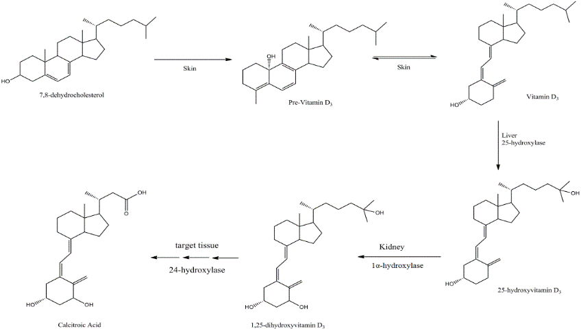 The generic term vitamin D designates a group of chemically related compounds; the two most prominent members of this group are vitamin D2 (ergocalciferol) and vitamin D3 (cholecalciferol) [1]. They are structurally similar secosteroid derived from the UV irradiation of provitamin D sterols. In vertebrates, vitamin D3 is produced in vivo by the action of sunlight on 7-dehydrocholesterol in the skin [2]. Since both forms of this vitamin are metabolized to a biologically active form that functions as a steroid hormone and the body is capable of producing vitamin D3, vitamin D does not meet the classical definition of a vitamin. A more accurate description of vitamin D is that it is a prohormone [3]. However, since vitamin D was first recognized as an essential nutrient, it has historically been classified among the lipid-soluble vitamins [3].
