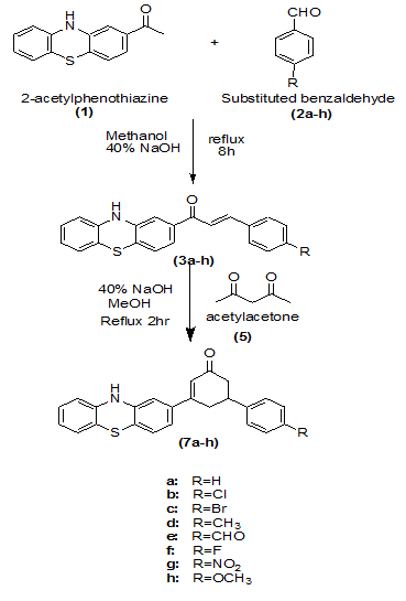 Chalcones and their cyclohexonones were prepared as per the procedure we have already reported [37] and characterised. 0.001 mole of 2-acetyl phenothiazine 1 was dissolved in 25 ml methanol and 0. 001 moles of different substituted benzaldehydes 2a-h were added, followed by the addition of 5 ml aqueous solution of NaOH (5%) and heated for 6 h with constant stirring in a magnetic stirrer. The reaction was monitored by TLC. After completion of the reaction, the reaction mixture was poured into ice-cold water, neutralized with con. HCl and left overnight in a refrigerator. The resulted precipitate was filtered, dried and the purity of the compounds was checked by TLC using chloroform as the solvent. The compounds were purified by column chromatography using silica gel (60-120 mesh).