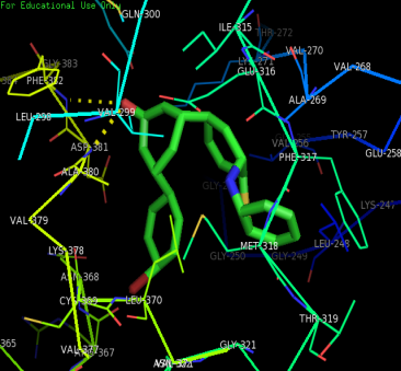 The catalytic sites of tyrosine kinase Receptor along with area and volume of binding pocket was carried out with Meta Pocket 2.0 Finder program [35]. In the binding pocket the Active site residues of T3151 ABL mutant are Ala350, Ala365, Ala366, Asn297, Arg483, Asp381, Asp421, Asp482, Cys305, Cys369, Gln477, Gly303, Gly372, Gly383, Gly426, Ile315, Ile347, Leu302, Leu364, Met458, Ser265, Thr267, Trp405, Tyr320 and Val299.