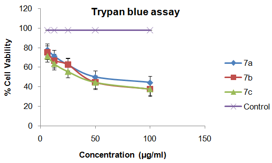 The effect of compound 7a-c on the viability of cancer cells (K562) was determined by trypan blue dye exclusion assay [38]. Briefly, the cells were plated at a density of 1x105in six-well plates followed by addition of different concentrations of compound (6.25, 12.5, 50 and 100 µg in 1 ml of DMSO) or untreated cell. After incubation for every 24 h, cells were collected and diluted in an equal volume of media and mixed with 20 ml of trypan blue. Cells were counted under the microscope using hemocytometer. All the experiments were performed in triplicate and yielded similar results [38].