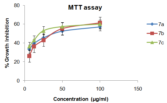The fig. 1 shows the hydrophilic and hydrophobic interactions of the ligands with the protein. From the table 1 it was learned that compounds 7a, 7b and 7c with H, chloro and bromo substituent respectively exhibited a reasonably good scores-12.716, 12.3456 and 14.665.0186 k cal/mol. These three compounds were selected for further in-vitro studies.