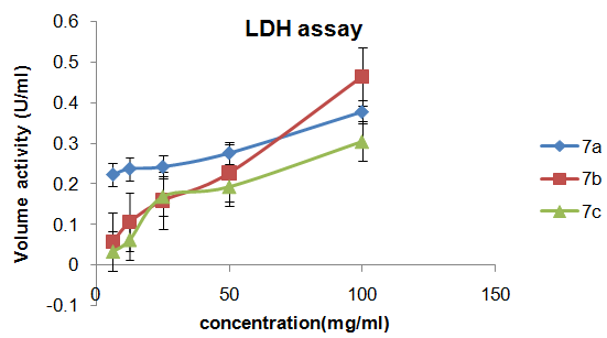 The lactate dehydrogenase (LDH) release is an indicator of membrane integrity and thus cell injury [39, 40]. LDH assay was performed to evaluate the LDH release to the media following treatment with the 7a-h (6.25, 12.5, 25, 50 and 100 μg) on K562 for 24 h and it was measured using standard protocols. The intracellular LDH was determined after lysing the cells by rapid freezing and thawing in liquid nitrogen. The LDH release was measured at an absorbance of 490 nm. The percentage of LDH release was calculated as: (LDH activity in media)/(LDH activity in media þ intracellular LDH activity) X100%. Results are presented as a percentage of LDH release subtracting the control values from treated ones. All the experiments were performed in triplicate fig. 4.