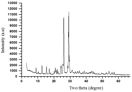 The powder XRD studies were conducted to study the physicochemical characteristics of the grown crystals. XRD spectra for the crystals are presented in fig. 2. In the powder diffractogram, sharp peaks at diffraction angles (2θ) 8.870, 12.600, 15.400, 24.470, 25.610, 26.120, 29.170, 31.290, 37.760, 43.560 and 44.570 were obtained in the case of ferulic acid. The grown ferulic acid crystals belong to monoclinic system and the cell parameters are a=4.6405Ao, b=16.824Ao, c=12.019 A o, β=90.15 °, V= 938.4 (1) Ao 3. The sharp intensity peaks found in spectra shows good crystalline nature and purity of the grown crystal.