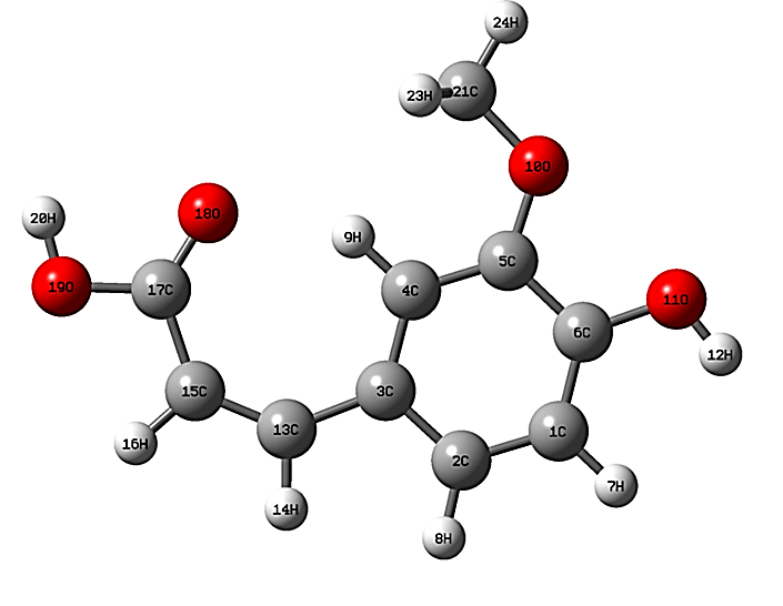 The geometrical parameters bond length, bond angle and dihedral angle of the chosen molecule were determined using the computational method DFT/B3LYP with the basis set 6-31+G**. The stability of the molecule was analysed by the energies obtained from the various conformers. From the conformational study, the global minimum energy was found to be-688.00953405 a. u and the optimized structure is given in fig. 3. The C1-C2, C1-C6 and C4-C5 bond length values were approximately 1.39 A0, whereas C2-C3, C3-C4 and C5-C6 were 1.41A0. This difference in the C-C bond length is due to the presence of the acid, methoxy and hydroxyl group attached to the ring carbon. The C3-C13 and C15-C17 bond length were quite increased to 1.4581 and 1.4655 A0, is due to the effect of the ethylene and the acid group attached to them. The C13-C15 has the smallest length 1.3612A0, which proves its double bond character. The C-O bonds take the same value approximately, whereas C=O bond is reduced depicting the double bond nature.