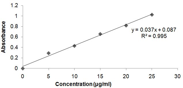 The QDs and Drug were taken in 1:2 ratios. Further, yield was determined. Then, 1 mg of QDs were taken from obtained yield and diluted in 10 ml of methanol. Further, dilutions were prepared, and absorbance was taken, it resulted that the absorbance value obeys the Beer’s and Lambert’s law. Final calculations were done, and drug content was determined.