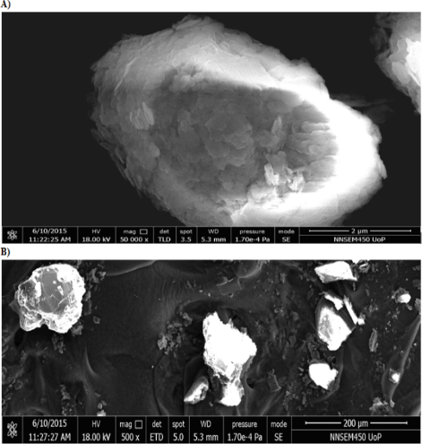 The surface morphology and shape of the 5-FU QDs were analyzed by scanning electron microscopy for optimized formulation confirms that 5-FU QDs are oval in shape with a smooth surface. Scanning electron microscopy was performed for drug loaded QDs and Eudragit E PO QDs of ratio 1:2 to obtain more information on the particle size and morphology. The photos of drug loaded QDs had shown that they have different morphologies as compared to formulated Eudragit E PO QDs. Moreover, the drug loaded QDs were observed with a rough surface, whereas Eudragit E PO coated QDs had a smooth surface.