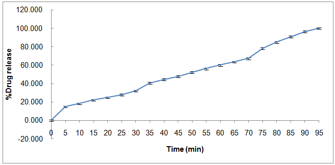 First, the phosphate buffer of pH 4.0 was prepared by dissolving 5.04 g of disodium hydrogen phosphate and 3.019 g of potassium dihydrogen phosphate in distilled water (1000 ml) and final pH was adjusted by addition of glacial acetic acid [11]. In vitro drug release was performed by putting 20 mg of Eudragit E PO coated QDs in 900 ml phosphate buffer (pH-4.0) using USP type II (Paddle) dissolution apparatus (TDT 08L Basic Electrolab) under stirring at 100 RPM. The temperature of dissolution medium was maintained at 37±0.5 °C. Samples were withdrawn periodically at 0 min, 5 min, 10 min up to 95 min and the volume was replaced immediately with fresh medium. Sample solutions were filtered and analyzed by measuring absorbance in at 266 nm. Further, (%) drug release was calculated as depicted in (fig. 15).