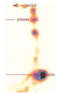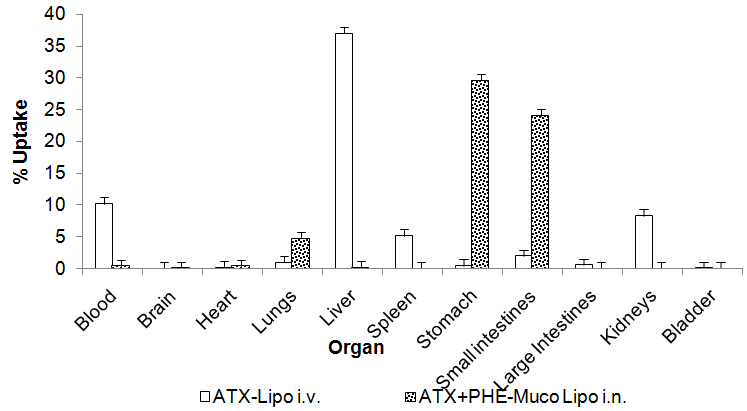 From fig. 4 and 5 it was observed that most of the radiolabeled intranasal drug solution and liposomal formulation appeared in the stomach of rat. Similar results were also reported by Patel et al. for intranasal brain targeted risperidone solid lipid nano particles [31]. This is also supported by the graphical depiction of the bio distribution of the radiolabeled drug in various organs of rat in fig. 6 and 7 after intranasal and intravenous administration of formulation respectively. However, a considerable amount of drug was seen in the brain for intranasal ATX+PHE Muco Lipo as compared to intranasal ATX solution at 30 min post administration.