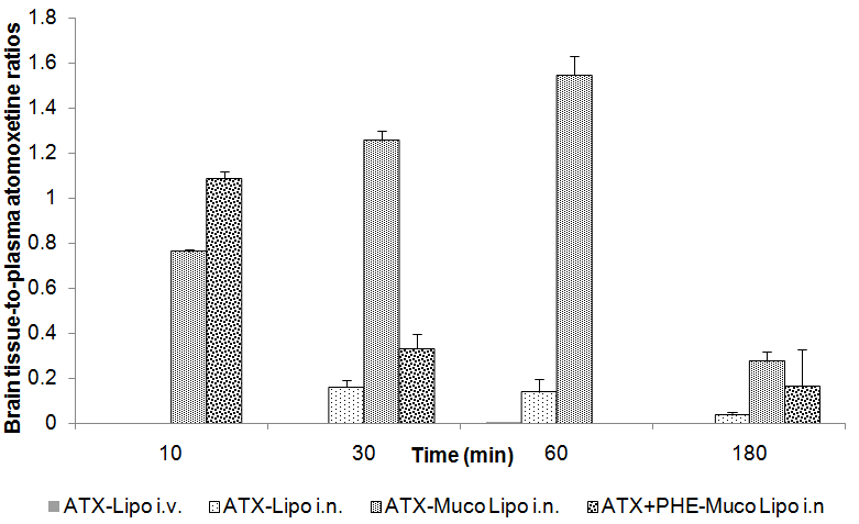 Conclusion: This preliminary investigation demonstrates a considerable extent of transport of ATX into the brain through i. n. ATX+PHE-Muco Lipo, which may prove to be a new platform for better management of ADHD.